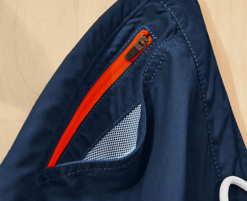 Cut in soft, quick-dry Portuguese polyamide, we've trimmed them with a host of clever details — the chunky rubber-tipped drawstring, a snap-closed back pocket, and a secure zip compartment at the hip for keycards and credit cards.